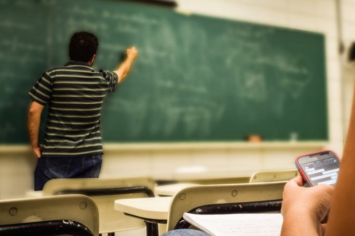 Docente anota en pizarra enseñanza y el alumno atento a su celular.Foto:ilustrativa